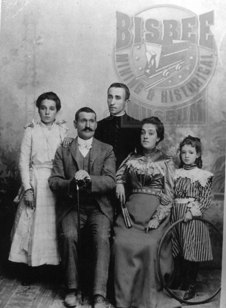 A Caretto family studio portrait taken in Torino, Italy by photographer Deastiz. Left to right: Chita, Baptiste, priest, Madalina, and Lucy Caretto. This albumen print is on a boudoir mount.