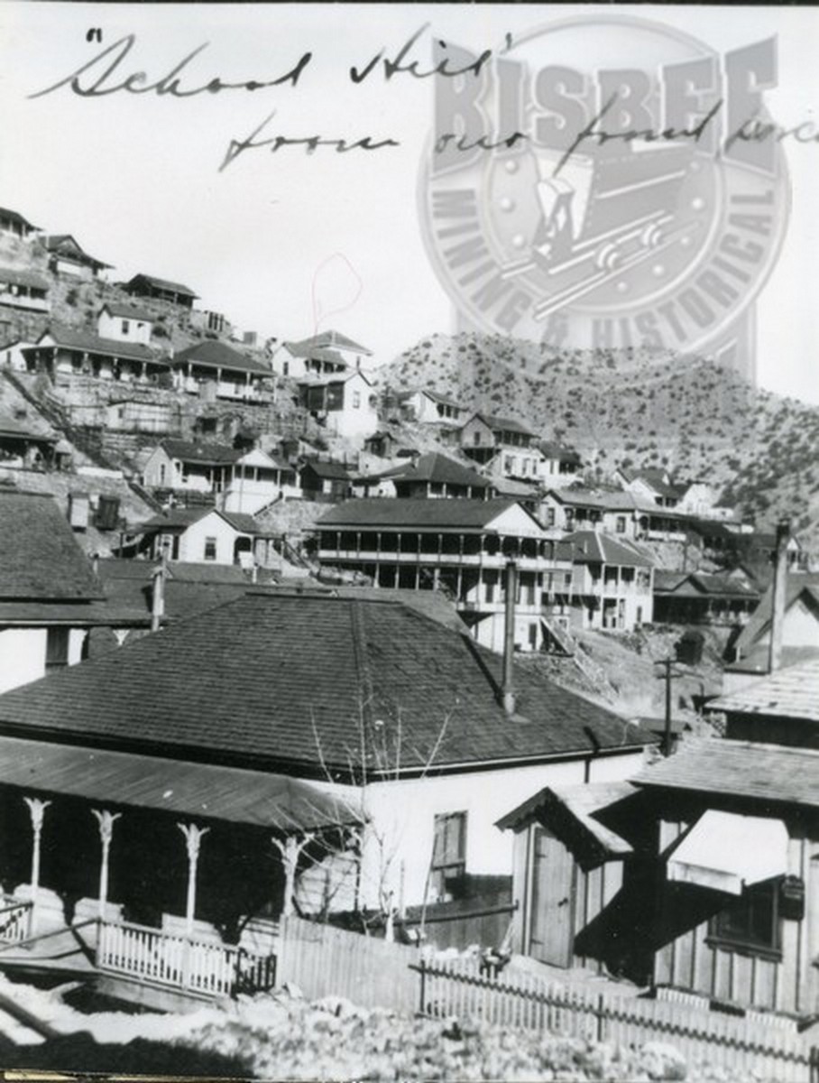 Photograph of the houses up the hill from High School Hill. Captioned: School Hill from our front porch.