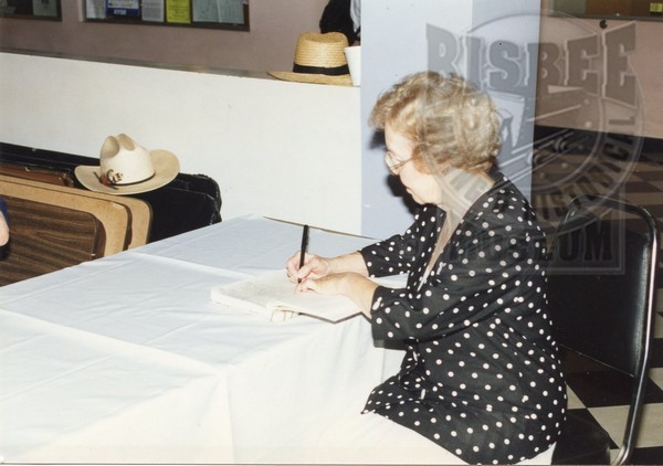 Bisbee Convention Center. Virginia McConnell is signinig something, possibly a guestbook for the opening oof the convention center.