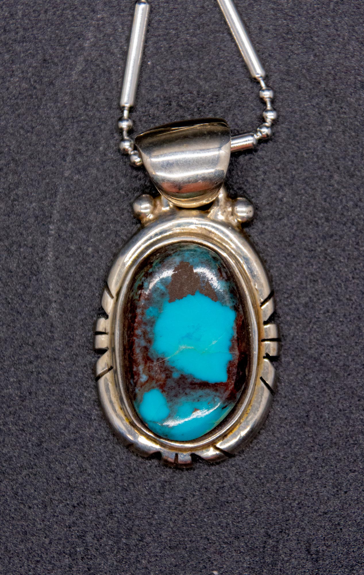 Home / Merchandise / Jewelry / Bisbee Turquoise and Silver Necklace Bisbee Turquoise and Silver Necklace$250.00 25mm pendant, 18″ silver chain, by Bisbee-owned Belkis Minerals Out of stock Categories: Jewelry, Merchandise Tag: jewelry